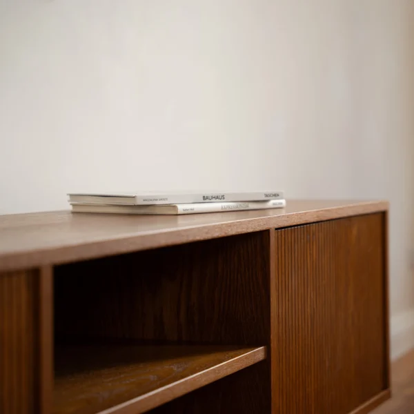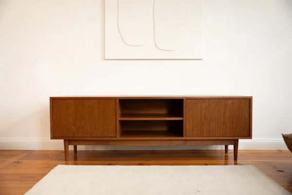 Medinė retro stiliaus komoda sukurta nesenstančiam namų interjerui. 5-6 dešimtmečio įkvėpta komoda tiks mid-century modern gerbėjams, vertinantiems minimalizmą ir vintage dizainą. Originali baldo forma ir elegantiška lentučių apdaila sukurs išskirtinę kompoziciją jūsų namuose. Tai puikus baldo modelis tiek svetainės kambariui, miegamajam ar namų ofisui. Baldas erdvus ir talpus, padalintas į tris dalis, dvi iš jų su uždaromis durelėmis, viena dalis – su atviru skyriumi, perskirtu lentynomis. Komoda tiks tiek klasikiniams, tiek moderniems interjerams.