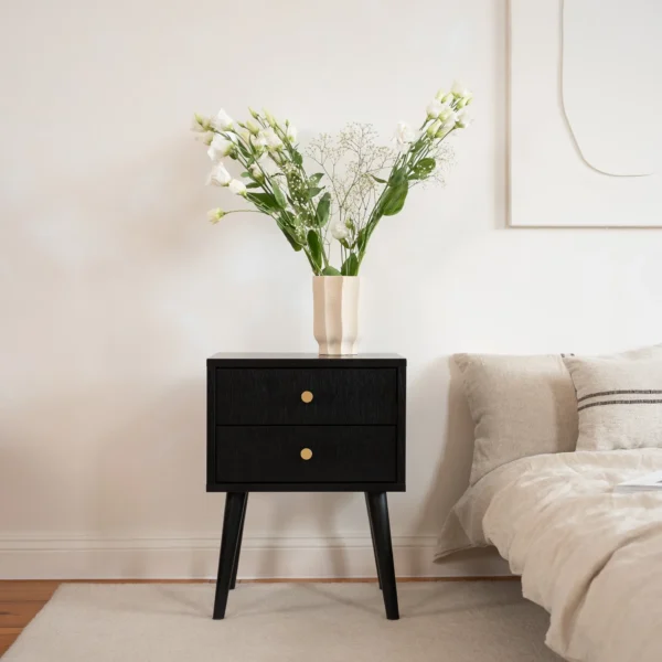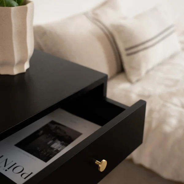Charakteringa ir funkcionali lovos spintelė Bedie Black. Elegantiškas juodai dažytas medis sukuria nesenstančią miegamojo kompoziciją. Įkvėpta septintojo dešimtmečio stiliaus, persmelkta minimalizmo. Bedie Black spintelė sukurta tiems, kam reikia daugiau vietos. Spintelė turi du stalčius ir platų paviršių, ant kurio galima pastatyti naktinį šviestuvą ar gėlių vazoną.