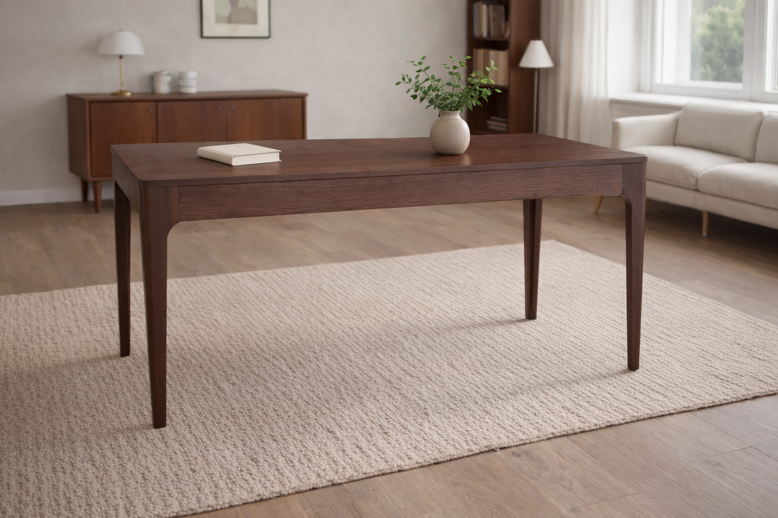 Išskirtinis ąžuolo lukšto stalas-konsolė Theo –  elegancijos ir ilgaamžiškumo dermė. Švelniai siaurėjančios kojos ir subtiliai užapvalinti kampai suteikia baldui išraiškingą mid-century charakterį. Šis stalas harmoningai įsilieja į įvairius interjero stilius, kuriuose estetika vertinama taip pat aukštai kaip ir išskirtinės detalės. Tai universalus baldas, tinkantis tiek valgomojo stalui, tiek konsolei. Matmenys gali būti koreguojami į jums tinkamus.